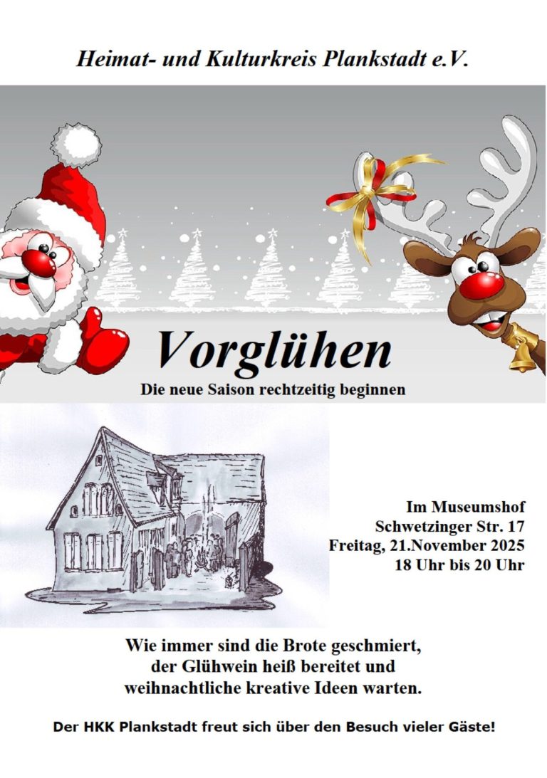 Am Freitag, den 21. November, wird im Heimatmuseum vorgeglüht! Beim wahrscheinlich ersten Glühwein der Saison und in gemütlicher Atmosphäre bietet der HKK Plankstadt im Heimatmuseum in der Schwetzinger Str. 17 die Möglichkeit sich auf die Adventszeit einzustimmen. Von 18:00 bis 20:00 Uhr gibt es Glühwein, Snacks und jede Menge vorweihnachtliche Stimmung.