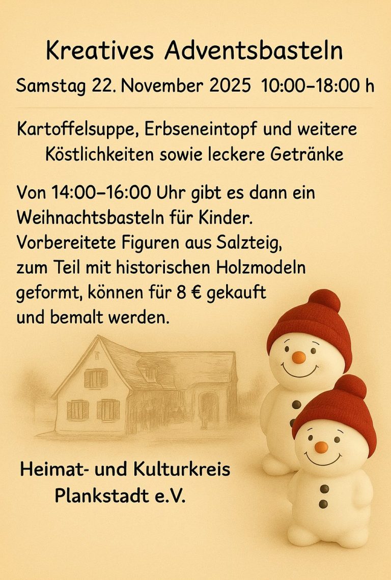 Der Heimat- und Kulturkreis Plankstadt blickt dankbar auf ein äußerst gelungenes Wochenende zurück. Der große Zuspruch zeigt, wie sehr solche gemeinsamen Veranstaltungen geschätzt werden und wie wichtig sie für das kulturelle und soziale Miteinander im Ort sind. Unser herzlicher Dank gilt allen Helferinnen und Helfern, den zahlreichen Unterstützern sowie allen Gästen, die mit ihrem Besuch zu dieser warmen, vorweihnachtlichen Atmosphäre beigetragen haben.